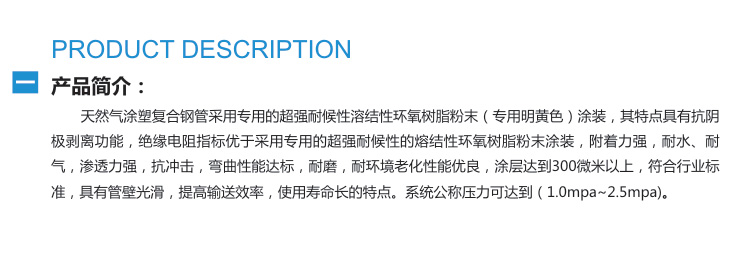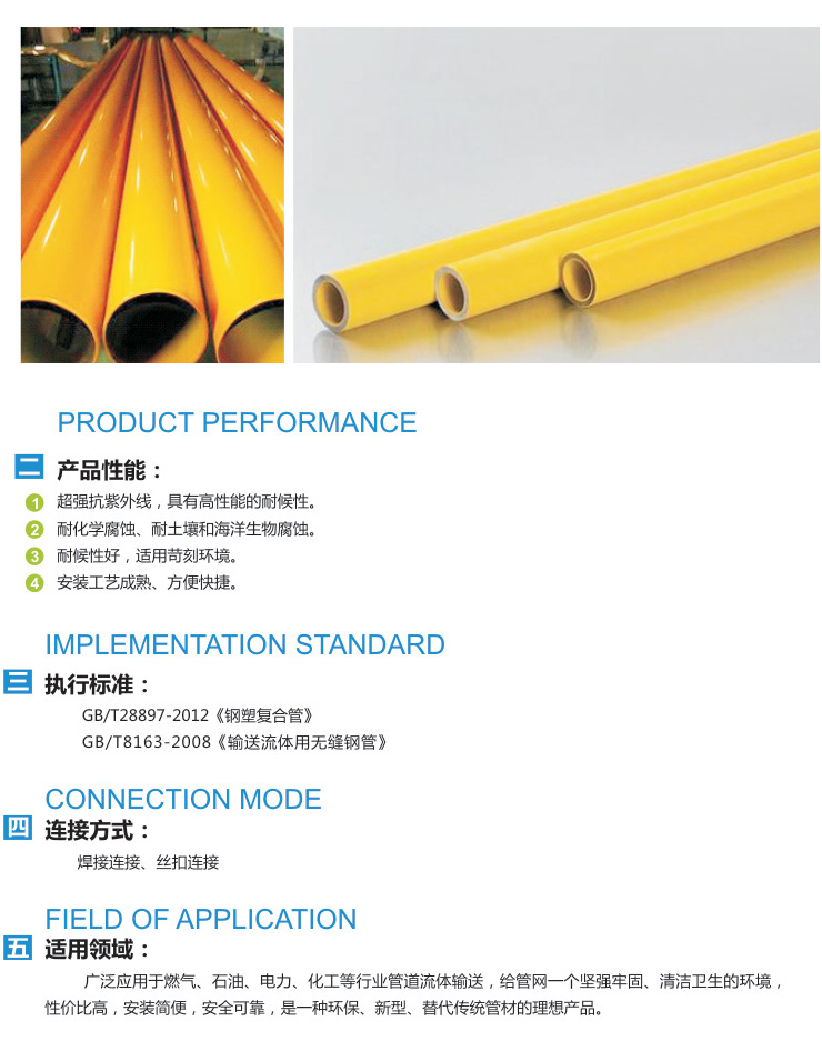 簡介:天然氣涂塑復(fù)合鋼管采用專用的超強耐候性溶結(jié)性環(huán)氧樹脂粉末(專用明黃色)涂裝,其特點具有抗明廢剝離功能,絕緣電阻指標(biāo)優(yōu)于采用專用的超強耐候性的熔結(jié)性環(huán)氧樹脂粉未涂裝,附著力強,耐水、耐滲透力強