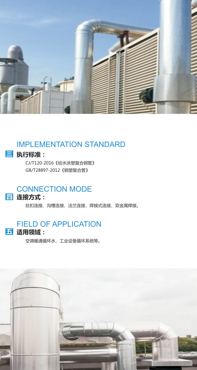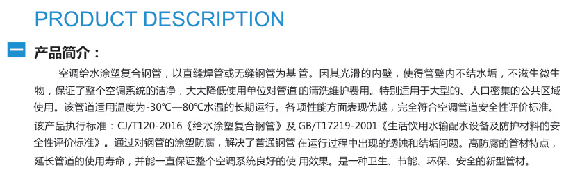 簡介:空調(diào)給水涂塑復(fù)合鋼管,以直縫焊管或無縫鋼管為基管。因其光滑的內(nèi)壁,使得管壁內(nèi)不結(jié)水垢,不滋生微生物,保證了整個(gè)空調(diào)系統(tǒng)的潔凈,大大降低使用單位對(duì)管道的清洗維護(hù)費(fèi)用。